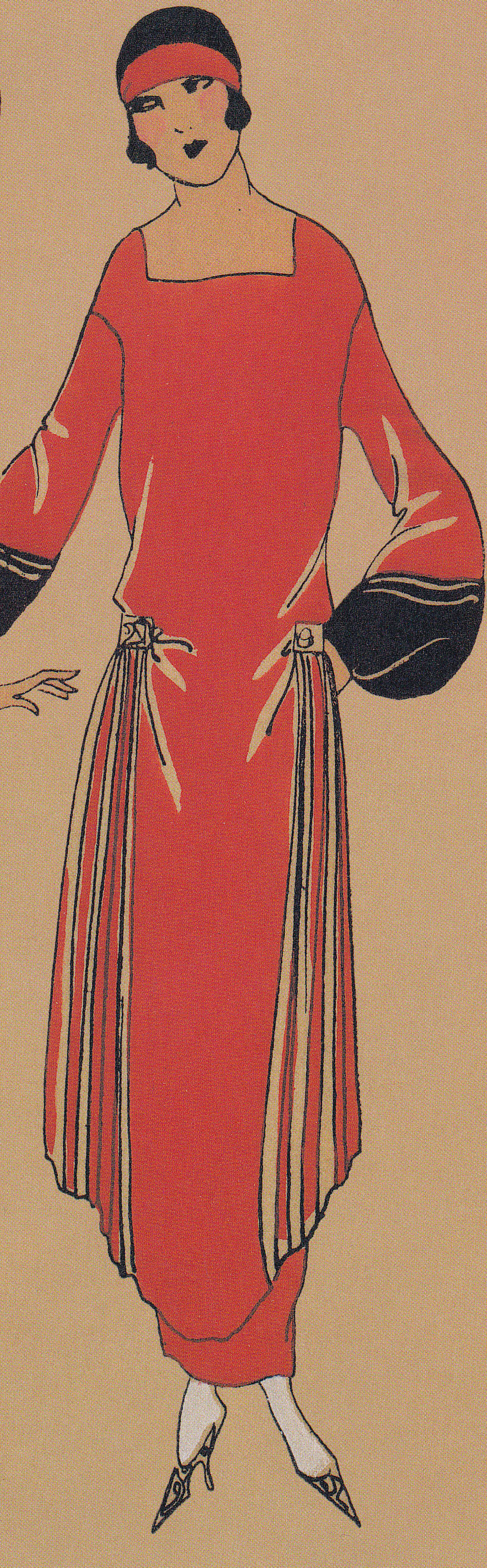 Judging by the slightly balloon shape of the dress around the waist, it must be early 1920s, rather than the later more typical boyish jazz age dresses.The shape is very similar to these gorgeous illustrations from “Art Deco Fashion” – which are also incredibly vivid in colour and cut and from 1922.