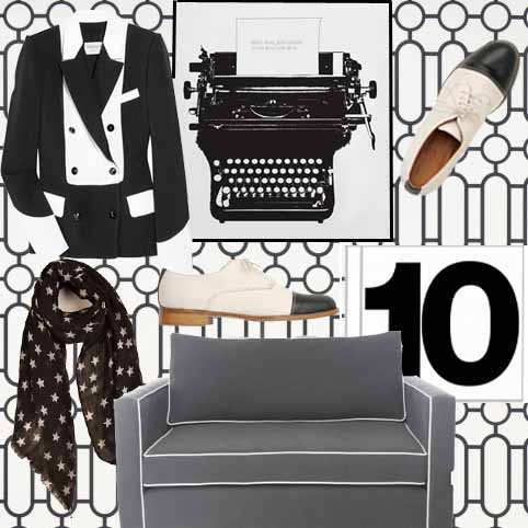 Clockwise from right: Designer’s Guild, Porden Wallpaper £38, Canvas Derby Shoes, Toast £175, 10 Digital CD, Colette, 59th Street Chair, Content by Conran, Black and White Star Scarf, Massimo Dutti £39.90,Tuxedo Jacket Yves St Laurent, Netaporter (in the sale £715), Typed Love Letter, Bodie & Fou £35.